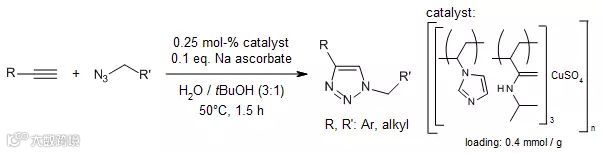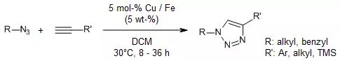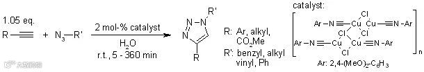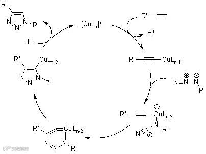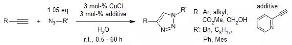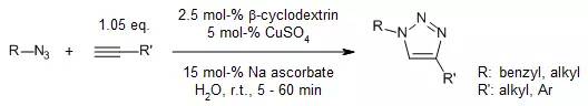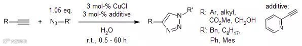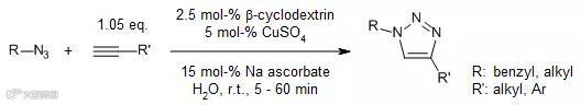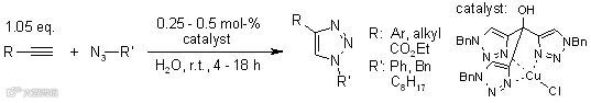 作为最经典的点击化学反应,铜催化的叠氮-炔环加成比非催化的1,3-偶极环加成反应速率提高了107 到 108 倍,在很大的温度范围内都能反应,对水不敏感,反应的PH范围4到12都可以发生反应,对很多官能团都有耐受度。纯产品可以通过简单的过滤和萃取得到,而不需要柱层析或重结晶。