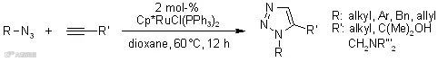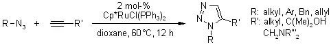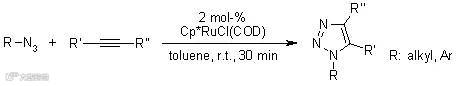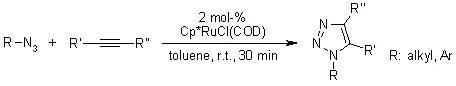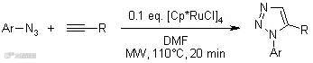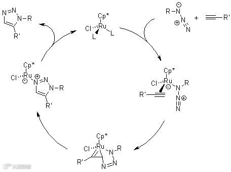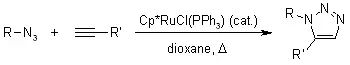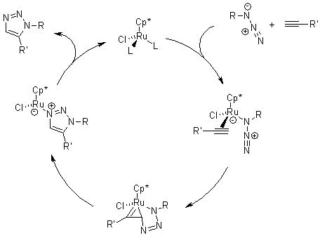 一个催化剂的研究表明五甲基环戊二烯氯化钌 [Cp*RuCl] 可以能够催化叠氮对末端炔烃的环加成,得到单一立体选择性的 1,5-二取代 1,2,3-三氮唑。另外RuAAC 可以用于催化非末端炔烃的加成,得到全取代的 1,2,3-三氮唑,这点与 CuAAC不同。