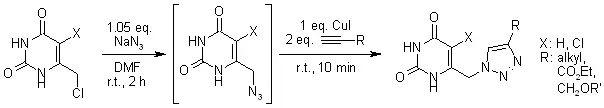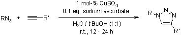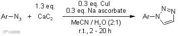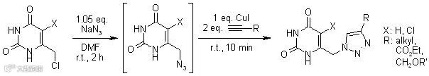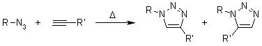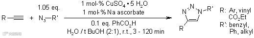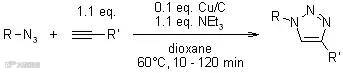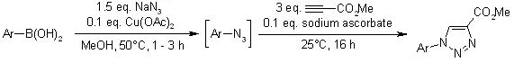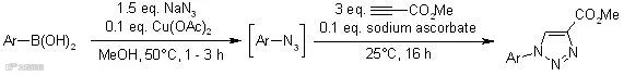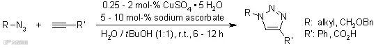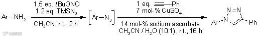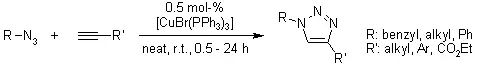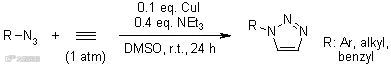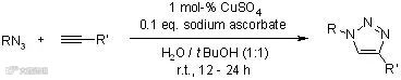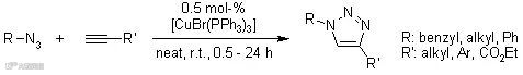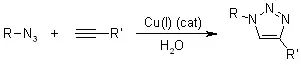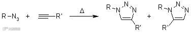 例如,叠氮-炔环加成满足点击化学的条件,单取代的炔和有机叠氮化合物一般比较廉价,另外一些也易于合成,它们的环加成得到1,2,3-三氮唑。