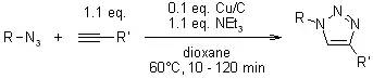 但是,热力学的Huisgen 1,3-偶极环加成需要很高的温度,并且当使用非对称的炔反应时得到是两种异构体的混合物。在这个意义上讲,经典的 1,3-偶极环加成并不属于点击化学的范畴。铜催化的改进方法可以在室温下水溶液中进行,而且与经典的Huisgen 1,3-偶极环加成生成两种异构体的混合物不同,此方法只生成1,4-二取代的的异构体。与之相反,近期发展出一种钌催化的反应可以得到另一种异构体(1,5-二取代三氮唑)。因此,催化的1,3-偶极环加成正好符合点击化学的定义,叠氮-炔环加成是经典的点击化学反应。