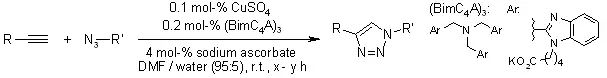 活性铜(I)催化剂可以直接用一价铜盐或通过抗败血酸钠还原二价铜得到。反应中会加入稍微过量的抗坏血酸钠防止氧化偶联产物的生成。Cu(II)盐和铜的混合物也可以生成活性铜(I)催化剂。