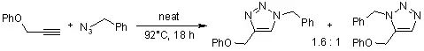 此反应是放热反应,但是很高的反应活化能导致反应速率很慢,甚至很高的温度,速率也很低。另一个缺点就是异构体,由于两种可能HOMO-LUMO在能级上差别不大,因此在热力学反应下得到近乎1:1的1,4-取代和1,5-取代的异构体。