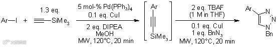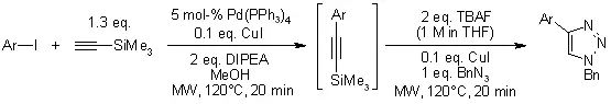 One-Pot Three-Step Synthesis of 1,2,3-Triazoles by Copper-Catalyzed Cycloaddition of Azides with Alkynes formed by a Sonogashira Cross-Coupling and Desilylation