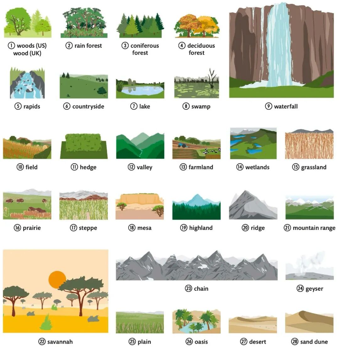 In this section, we will explore various geographical features and landscapes that make up our planet's diverse terrain. From forests and plains to deserts and polar regions, each type of landscape has its unique characteristics and significance. Let's delve into some key vocabulary related to these geographical features.