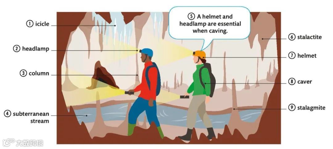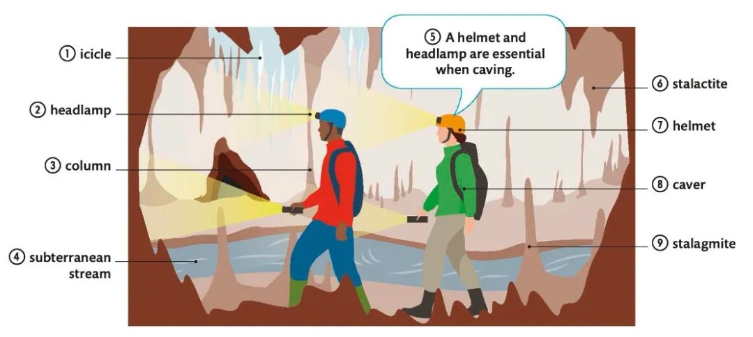 在这一部分,我们将深入探索洞穴和探洞的迷人世界。我们将学习一些基本词汇,这将帮助你更好地理解与探索这些自然奇观相关的特征和设备。