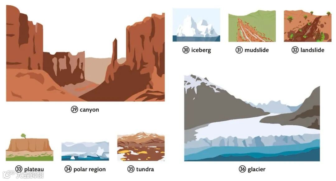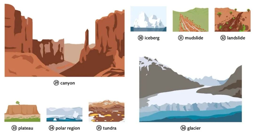 在这一部分,我们将探索构成我们星球多样地形的各种地理特征和景观。从森林和平原到沙漠和极地,每种类型的景观都有其独特的特征和重要性。让我们深入了解一些与这些地理特征相关的关键词汇。