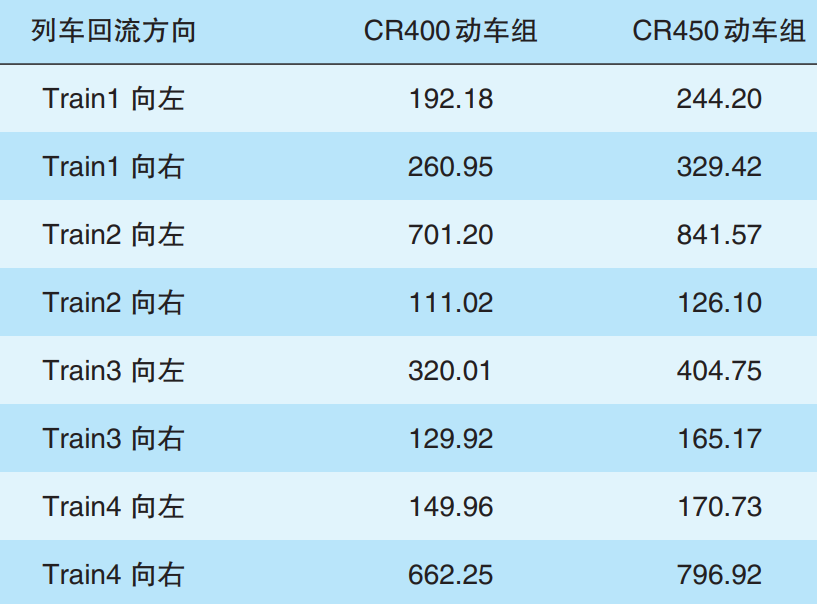 基于上述不利场景(即上下行供电臂分别有2列车追踪运行)展开计算及分析,CR400、CR450动车组牵引回流计算结果对比见表1。其中,该站场区间追踪运行的具体配置为:(1)下行区间内2列列车追踪运行;(2)上行站内1列正线通过列车与其后方1列区间列车相距20km紧密追踪运行。