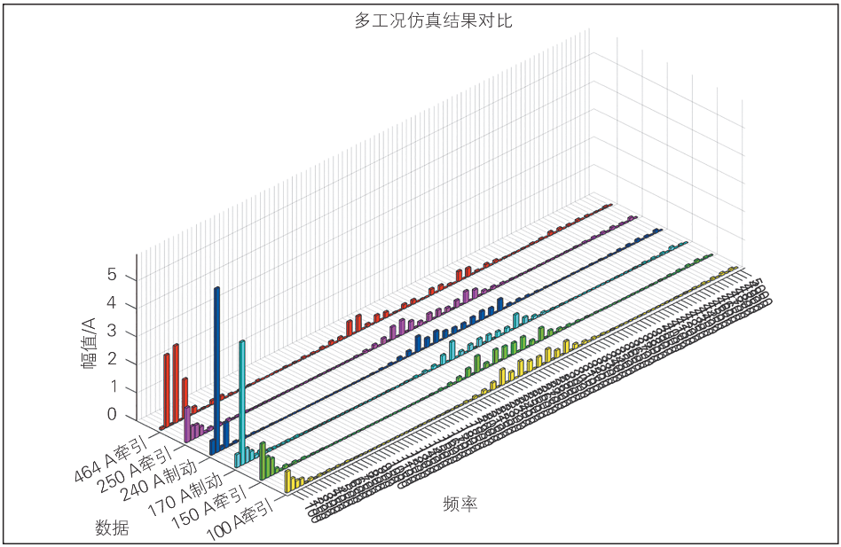 通过对列车在不同工况下的谐波干扰幅值和频率分布进行预测仿真计算,确定主要的谐波成分及其频率。结果显示,牵引系统在启动、加速、制动等工况下产生特定谐波电流,可能对轨道电路等信号设备造成干扰。由此可见,高次谐波幅度与PWM整流器的调制策略有关,主要集中在1400、2800Hz附近,均处于 ZPW-2000系列轨道电路信号频段附近;另外,随着牵引功率和电流的增加,谐波幅值并未显著变化,但最高幅值的谐波频率有所移动。多工况下牵引电流谐波分布见图2。