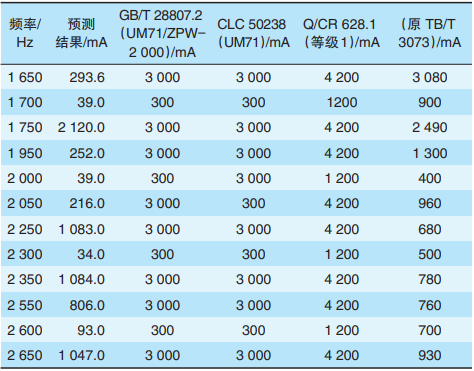 针对CR450动车组,对各谐波最大值进行预测(见表3)。频率范围涵盖国产移频、ZPW-2000系列轨道电路信号工作频段,以及2700~3000Hz频段。