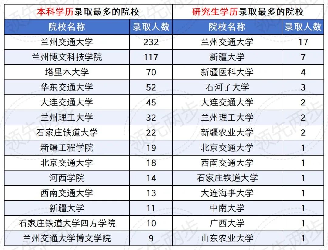 从本科及以上学历的录用情况来看,交通类大学在进入铁路局方面具有明显优势。此外,本地高校如塔里木大学、新疆大学等,由于其对本地情况的熟悉以及与当地企业长期的合作关系,在乌鲁木齐局的招聘中,其毕业生也拥有较多机会。