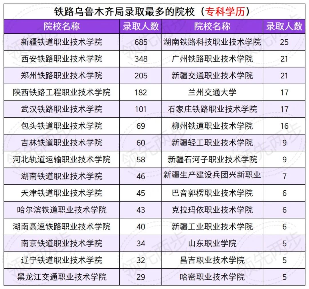 从整体数据来看,在 2024 年专科层次的录用中,排名前三的这三所院校录用人数共 1238 人,超过高职(大专)总录用人数的一半,达到 55% 。并且在 2024 年度校园招聘中,国铁乌鲁木齐局录用专科毕业生较多的院校主要分布在北方地区,这些院校在铁路专业教育资源、教学质量以及与铁路企业的合作深度等方面具有一定优势。