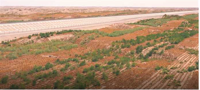 全线种植苗木共计1296.1万株,其中种植乔木89.1万株,种植灌木1206.9万株。全线风沙用地22.6万亩,1.5m高立式阻沙沙障1541.4公里,0.8m高芦苇方格储沙沙障154.5万平方米,0.3m高芦苇方格固沙4603.4万平方米,林带覆盖面积11.3万亩。