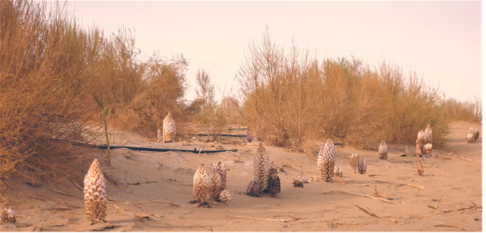 4、“以林养林”示范点:在DK255~DK258铁路两侧的植物防护林带中开展了以林养林研究,在梭梭植株的根部寄生经济作物大芸。