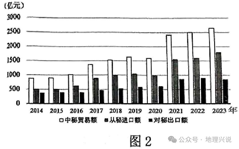 【分析】本题以钱凯港的位置及规划建设中的铁路示意图、中国-秘鲁贸易情况统计图等为材料设置试题,涉及人口分布及原因、区域发展、交通运输点的选择等相关知识点,考查学生获取和解读地理信息、调动和运用地理知识的能力,体现了区域认知、综合思维的学科素养。