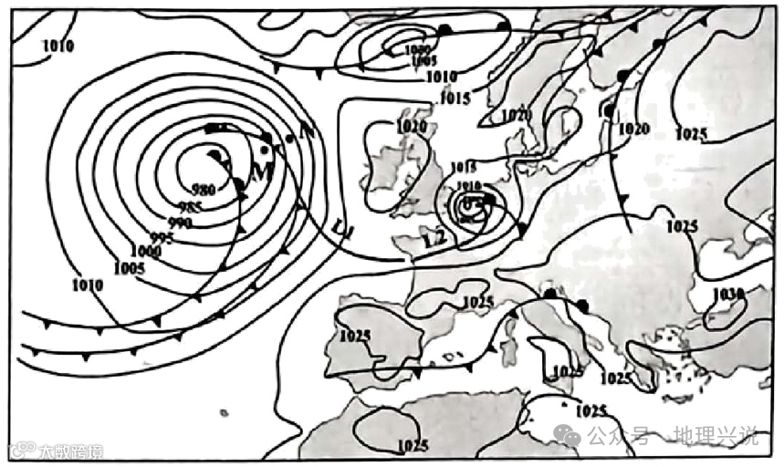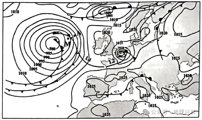 【解析】22.根据材料信息可知,锢囚锋是由冷锋追上暖锋或由两支冷锋迎面相遇将锋前的暖气团抬离地面,禁锢在高空形成的一种特殊锋面。锋面L1所在的锢囚锋系统,两个锋不是迎面相遇,应为冷锋追上暖锋形成的锢囚锋,图中有冷锋,锋面L1为被追上的暖锋;L2所在的锢囚锋系统,两个锋不是迎面相遇,应为冷锋追上暖锋形成的锢囚锋,图中有暖锋,锋面L2为追上暖锋的冷锋,A正确,BCD错误。故选A。