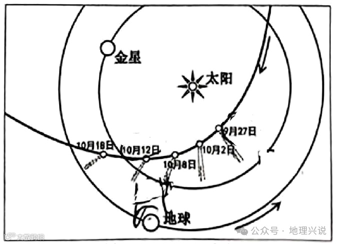 【解析】24.结合材料信息,当彗星接近太阳时,在太阳辐射和太阳风的作用下,其挥发物升华而形成彗尾。由此分析,彗星与太阳距离越近,彗尾越长。“紫金山—阿特拉斯”彗星在9月27日经过近日点,9月27日之后,彗星逐渐远离太阳,观测到的彗尾越来越短,A错误。根据图中地球公转轨道的箭头指向可以推断,图示地球自转方向为逆时针(自西向东)。面向太阳一侧为地球的昼半球,图中所示地球的右侧为晨线所在位置(东方),左侧为昏线位置(西方)。结合10月2日彗星的位置可以分析出,在10月2日日出之前可以观测彗星,此时彗星位于地球的东方低空,B正确。图中信息显示,10月8日时,彗星从地球看与太阳靠得最近,几乎不可见,C错误。10月12日后,彗星位于地球的西方低空且逐渐远离地球,结合图示彗星位置的变化分析,同一时刻彗星高度逐渐升高,D错误。故选B。