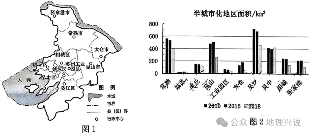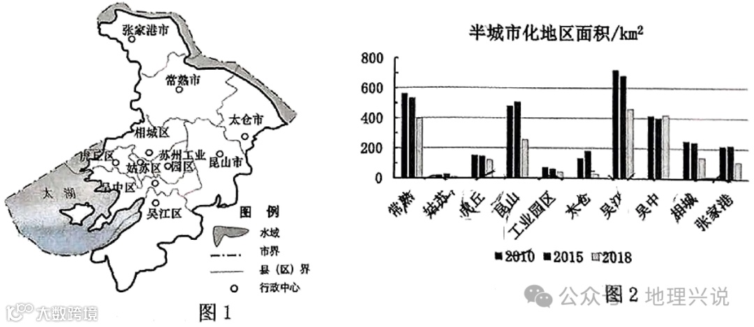 半城市化地区是指在大城市边缘地带涌现出的具有“非城非乡、半城半乡”特征的过渡性地域。苏州市下辖5区,代管4个县级市,其中姑苏区是苏州主城区,各区县经济水平差异大。读苏州市行政区划示意图及半城市化地区面积统计图,完成下面小题。