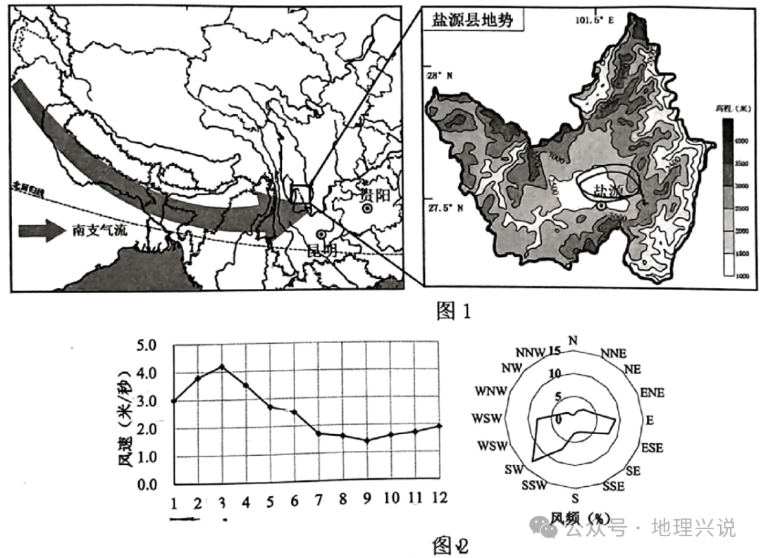 【详解】(1)结合图片信息和所学知识,盐源县地势较高,且位于西风带南支气流的势力范围内,冬春季节受到南支气流的影响,风速较强;其次,盐源县地处青藏高原东南缘,靠近横断山脉,这一区域是季风气候与高原气候的过渡带,南支气流与南下高原季风气流汇合,使得西风势力更加强劲;观察地形图可知,盐源县地形以山地和高原为主,西南部山谷和垭口等地形特征显著,当气流经过狭窄的山谷或垭口时,风速会因“狭管效应”而显著增强。