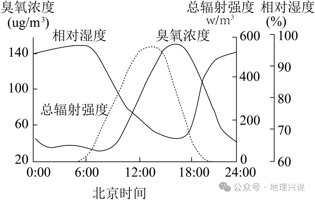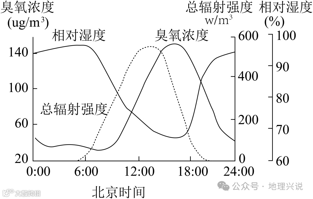近年来,臭氧污染逐渐成为新的关注焦点。臭氧的产生与人为污染源排放、气象条件密切相关。下图示意2022年夏季某市某日臭氧浓度、空气相对湿度和太阳总辐射强度的日变化情况。完成下面小题。