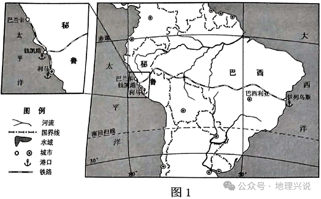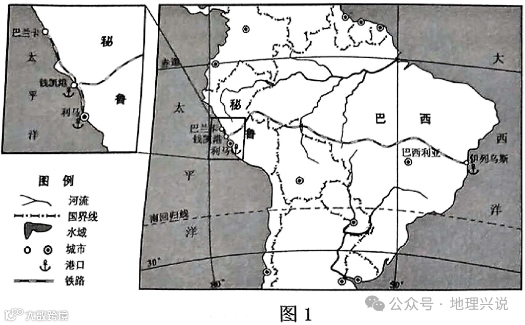 【详解】(1)结合图示信息及所学知识,秘鲁和巴西所处纬度较低,气候湿热,不适宜人类生存,而高原山地地区海拔高,气候凉爽,沿海地区受海洋调节,气候较为温和,适宜人类生存。所以,秘鲁和巴西两国人口集中分布于高原山地、沿海地区。
