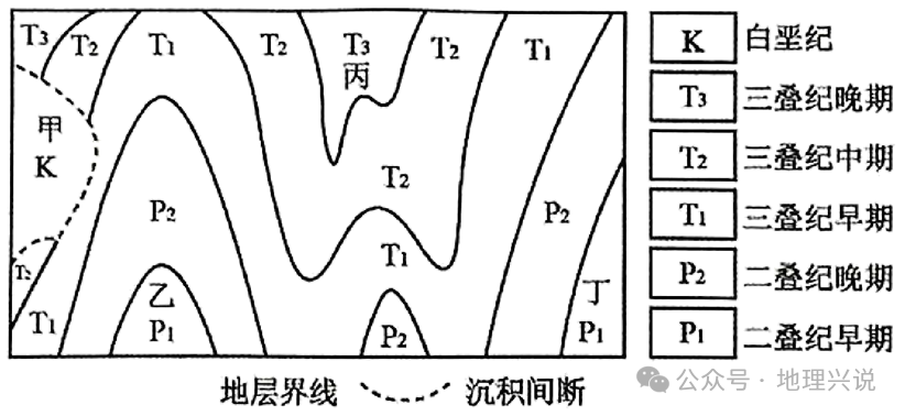 【解析】12.由图可知,甲处往北(由中心向两侧)分别为白垩纪、三叠纪中期、三叠纪晚期,地层先变老后变新,不符合背斜构造,A错误;乙处往东西方向或往北,分别为二叠纪早期、二叠纪晚期、三叠纪早期,地层由老到新,是背斜构造,B正确;丙处往东西方向或往南,分别为三叠纪晚期、三叠纪中期、三叠纪早期,地层由新到老,是向斜构造,C错误;丁处地层不完整,无法判断其构造类型,D错误。故选B。
