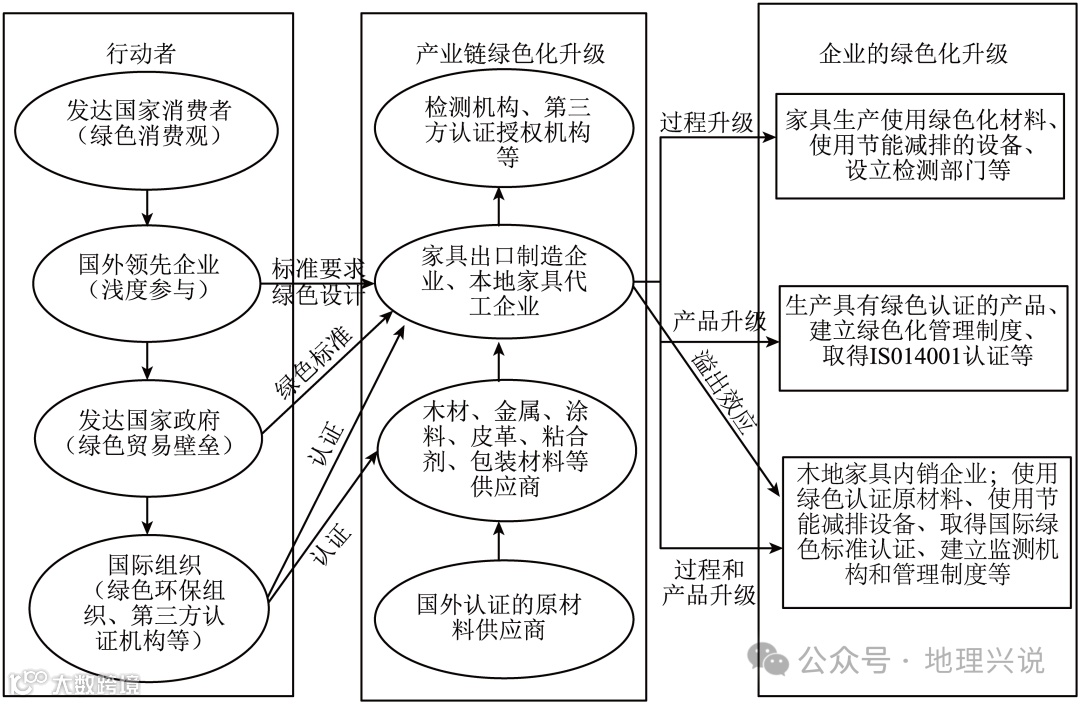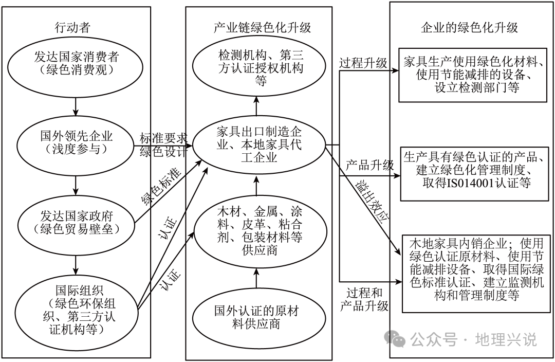 家具产业绿色化升级是指在全球价值链影响下,本地家具产业提升环境表现和减少环境危害的过程。读东莞家具产业绿色化升级路径图,完成下面小题。