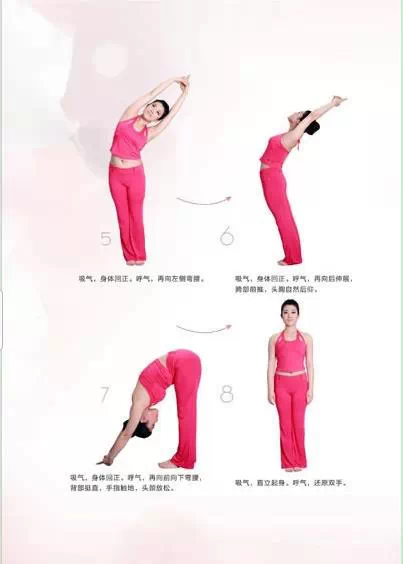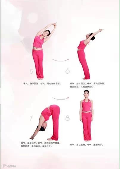 第一式:向上拉伸。双手手指交叉相握,掌心向上,踮起脚尖,全身尽力往上拉升,瑜伽式的腹式呼吸十次,即吸气时肚子外鼓,呼气时收腹,这样腹肌也能很好地参与运动。