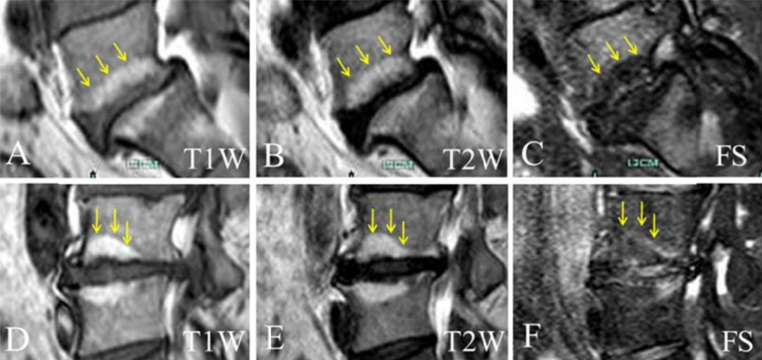 Ⅰ型:组织学表现为终板及终板下区域有丰富的肉芽组织长入, 纤维血管组织代替了增厚的骨小梁间的正常骨髓,从而延长了椎体 T1、T2 驰豫时间,T1WI 上终板及邻近骨质表现为低信号,T2WI 上表现为高信号,抑脂序列呈高信号,表明骨髓水肿。
