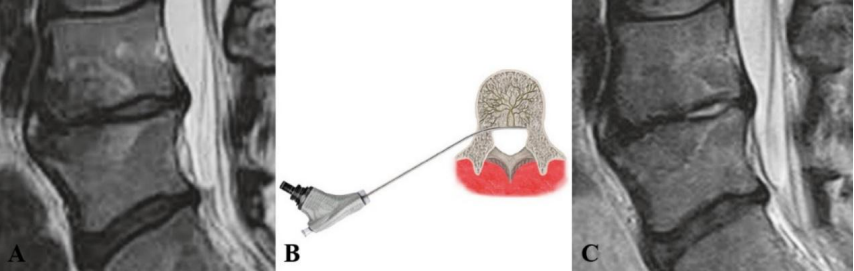 2021 年,Conger 等进行系统综述发现有中等质量的证据表明,在根据存在 Ⅰ 型或 Ⅱ 型 Modic 改变选择慢性腰痛患者时,椎体内椎基神经射频消融术可有效改善慢性腰痛患者的疼痛和功能障碍。这可能与灭活了椎体内的椎基神经, 阻断了神经传导通路有关。