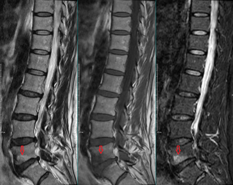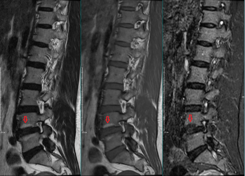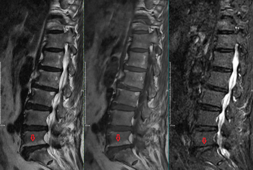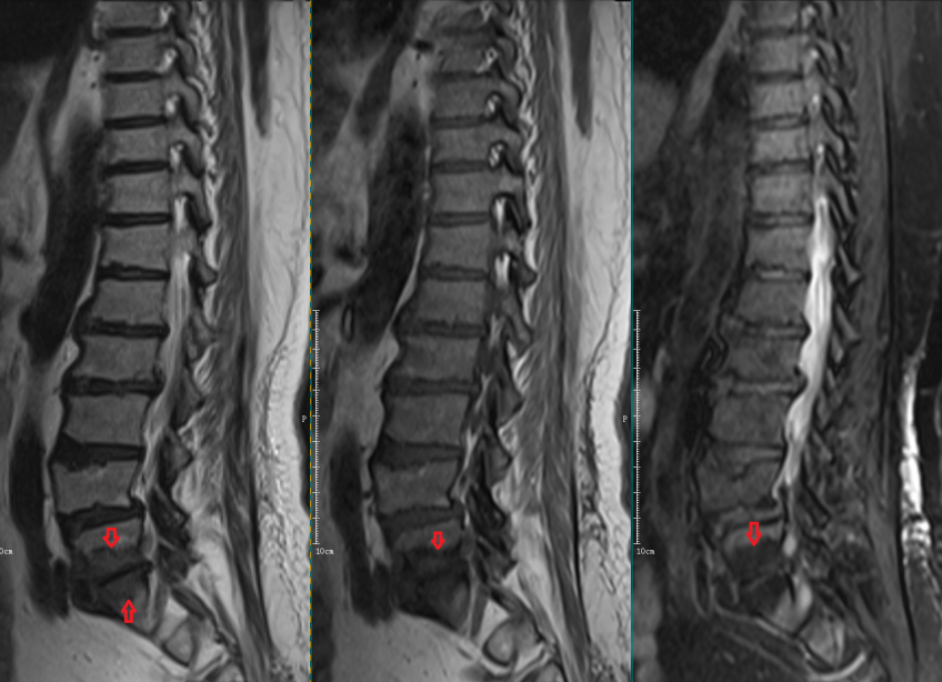 L5-S1椎间盘上下缘见条带状异常信号,T1WI低信号,T2WI高信号,STIR序列高信号。
