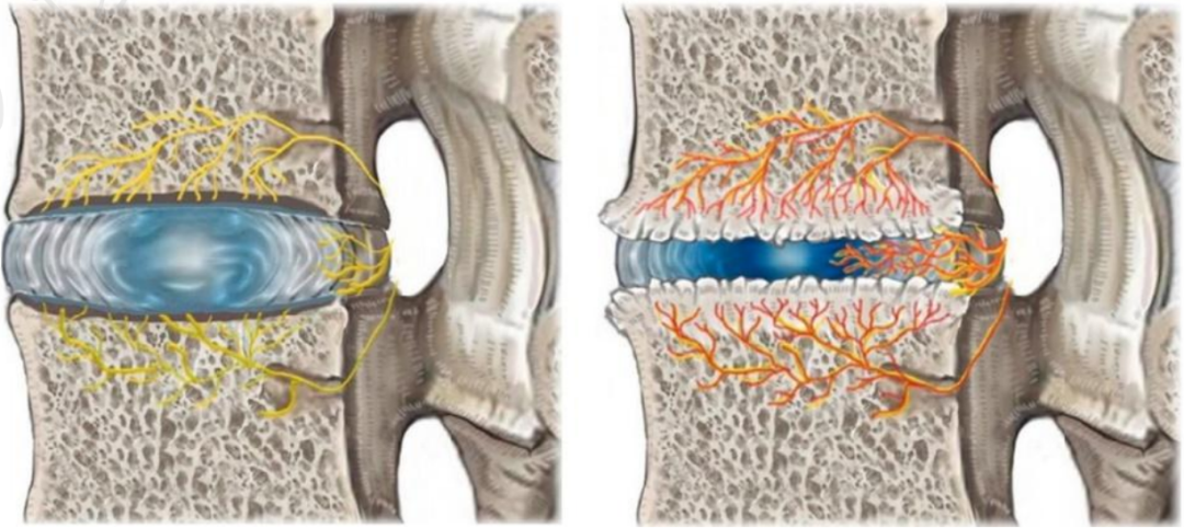 左图为正常的纤维环和终板神经支配情况,右图为病变的纤维环和终板,可见神经末梢向深层长入。