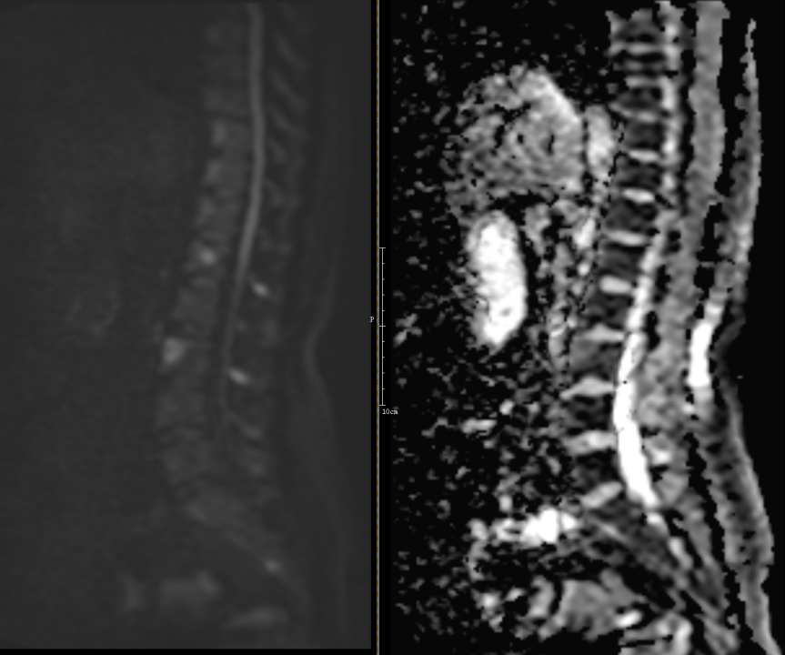 MRI示 部分椎体及附件信号异常,T1WI及T2WI呈低信号,STIR序列呈明显高信号,DWI序列呈高信号。考虑为转移瘤。