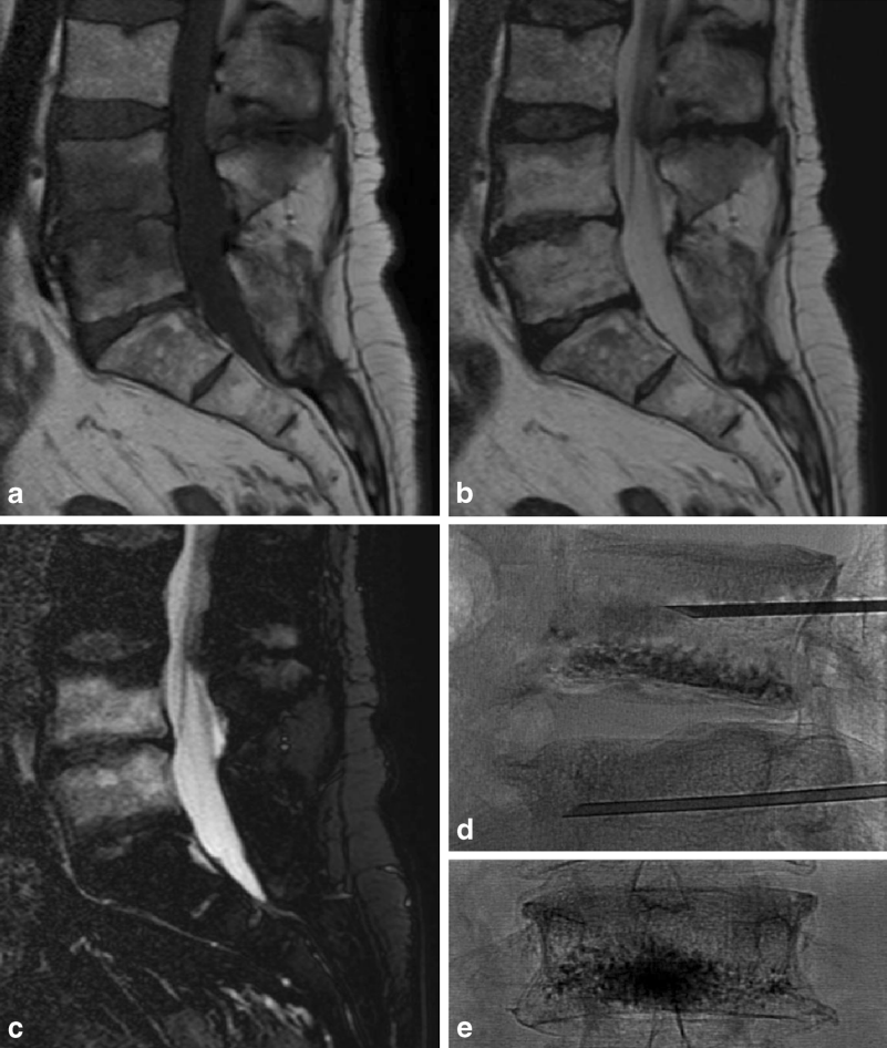 a、b 和 c 提示 L4/5 椎体 Ⅰ 型 Modic 改变,d 提示 L4、L5 进行骨水泥注射的术中影像,e 提示术后复查 L4 椎体骨水泥填充情况。