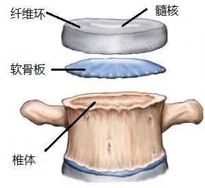 椎间盘由纤维环、髓核及透明软骨终板组成,其中软骨终板即椎体的上下软骨面,形成髓核的上下界,与相邻的椎体分开;纤维环是在上下软骨板的周围有一圈同心层排列的纤维组织;髓核是一种富有弹性的半流体的胶状物质,占椎间盘横切面的 50%~60%。