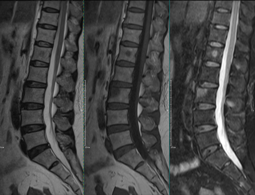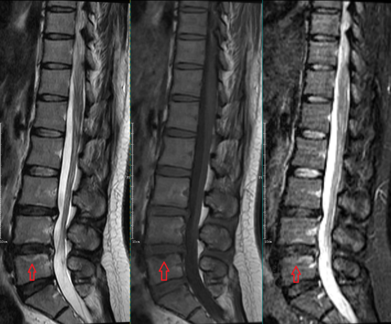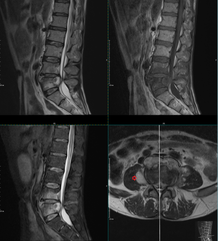 L5-S1椎间盘上下缘见条带状异常信号,T1WI高信号,T2WI高信号,STIR序列低信号。
