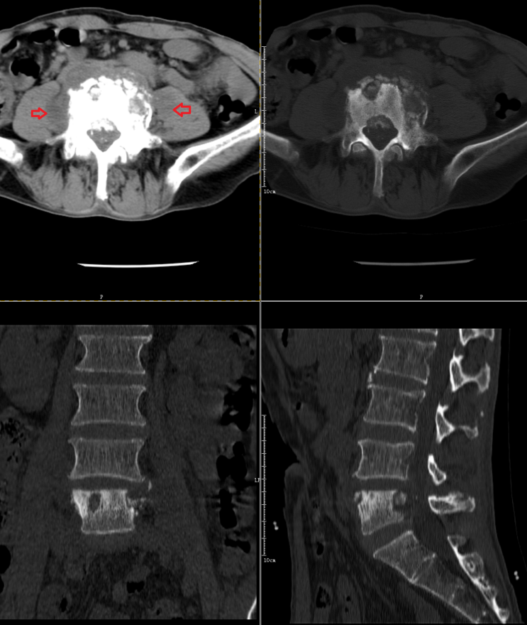 L4、5椎体结核伴椎旁脓肿形成。