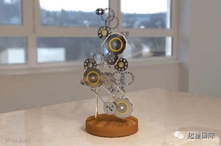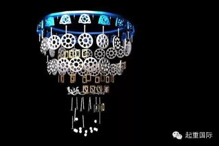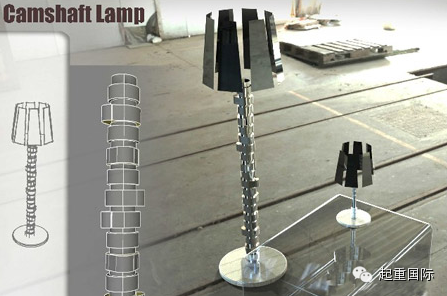 作品名称:环。是个灯具,很漂亮,有发动机壳、马达九孔盘、垫片、推杆等元素。