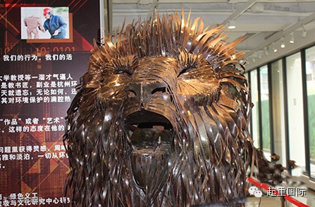 这是一头傲视群雄的狮子,它由上万片报废的铁片经过有序的排列,等比和对称关系组合最终制作而成。它是站着地,醒着地,我想通过它来传达一种理念,垃圾是可以创造奇迹的,希望它可以唤醒人们对于环境保护的重视。