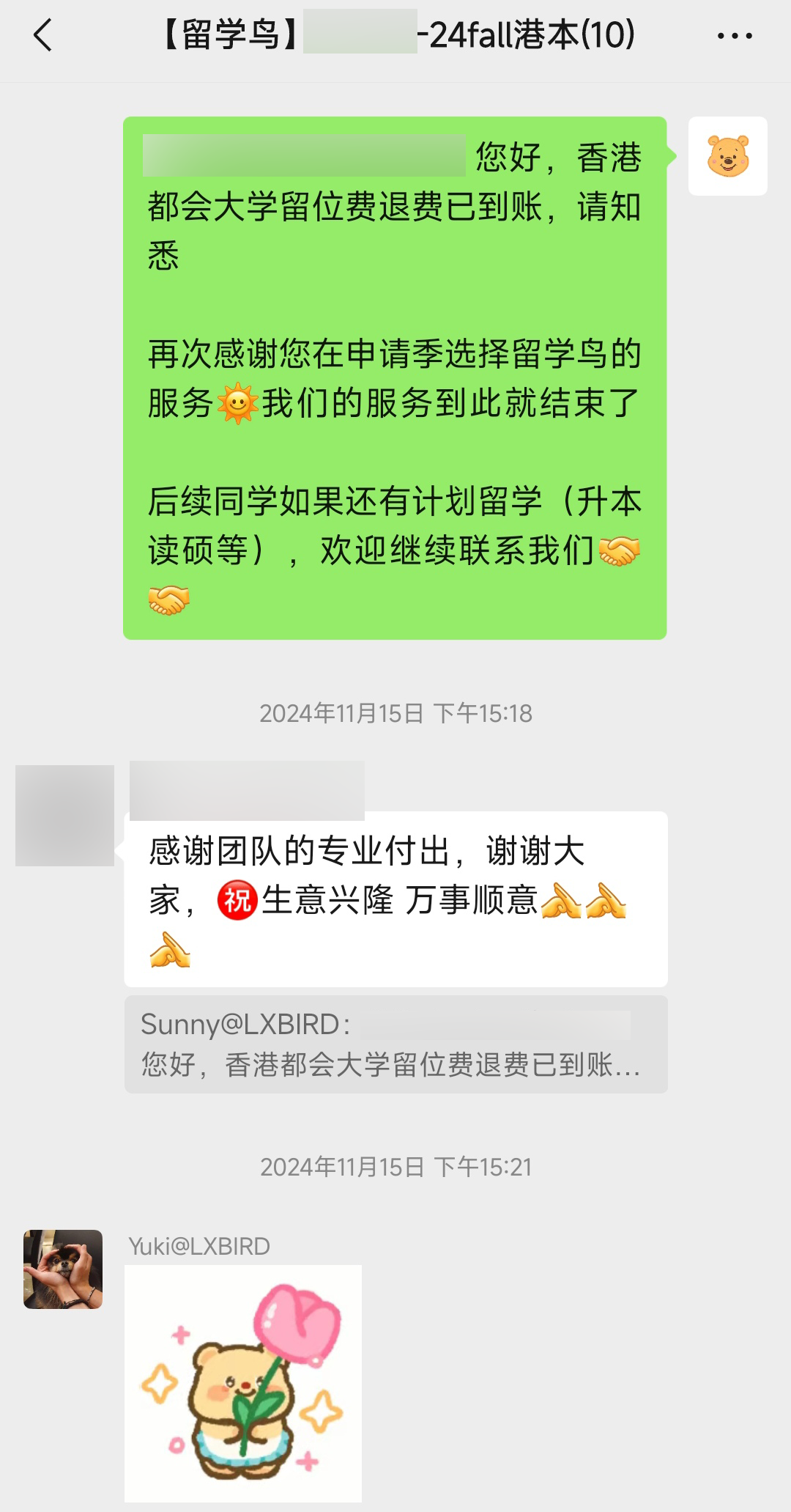留学鸟的老师也帮我联系港都会,成功退回了留位费。