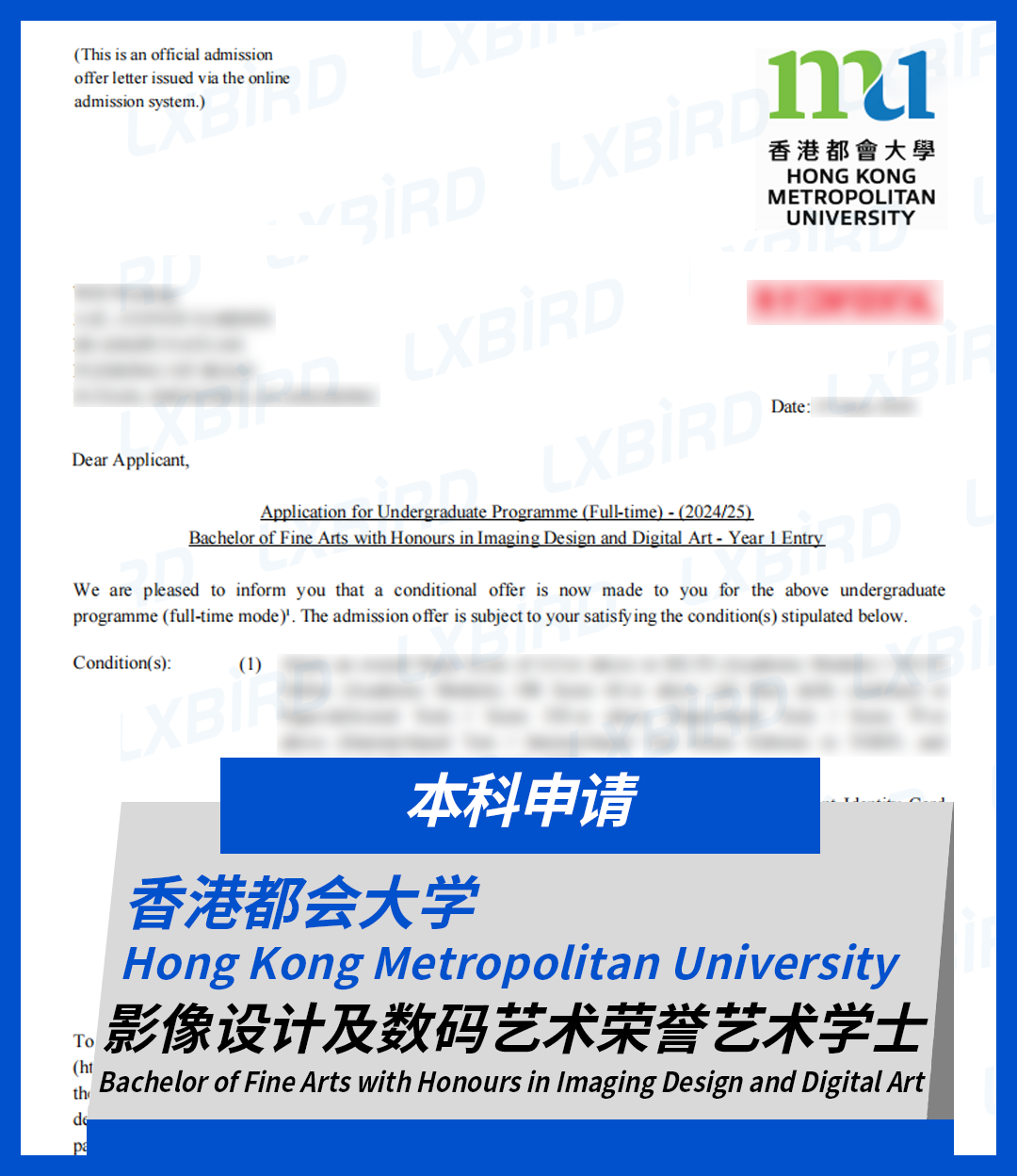 ● 香港都会大学 - Bachelor of Fine Arts with Honours in Imaging Design and Digital Art - 影像设计及数码艺术荣誉艺术学士:2024年5月中下旬递交申请 - 2024年5月末收到面邀 - 2024年6月中旬收到offer