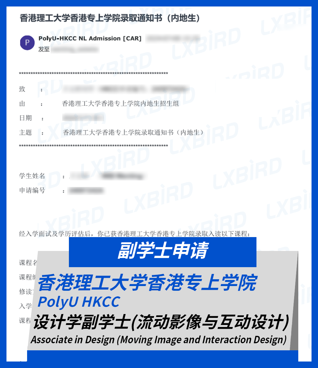 ● 香港理工大学香港专上学院 - Associate in Design (Moving Image and Interaction Design)- 设计学副学士(流动影像与互动设计):2024年5月中旬递交申请 - 2024年6月末收到面邀 - 2024年7月初收到offer