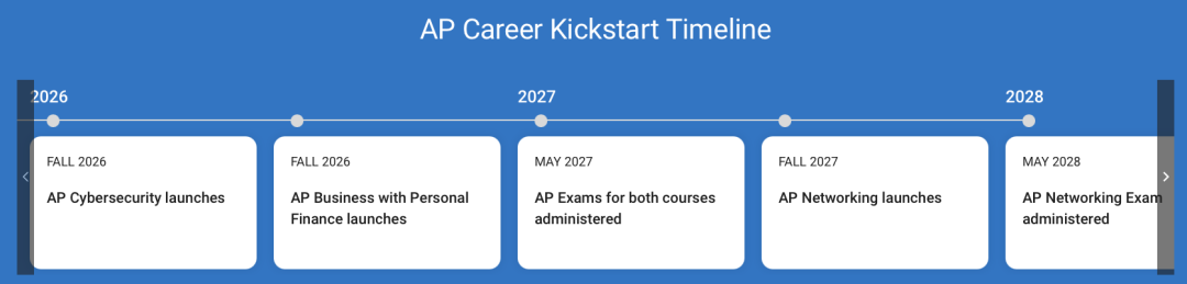 College Board邀请了美国商会(U.S. Chamber of Commerce)、科技巨头IBM等行业领军者加入课程设计,共同打造“AP职业起步计划 (AP Career Kickstart)”。其系列课程将深度融合职业与技术教育(CTE),标志着AP课程将从“学术导向”迈向“学术+职业技能”新时代!与之前AP课程最大不同是:学生在通过课程考试同时还可以获得行业认可的职业技能证书。