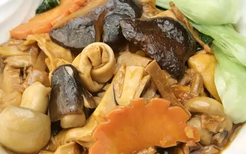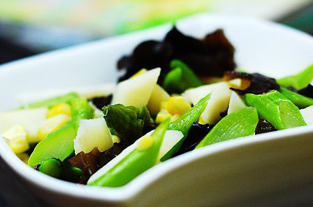 芦笋含有丰富的维生素、芦丁、核酸等成分,可以降低血液中的胆固醇水平,对淋巴瘤、膀胱癌、皮肤癌有一定疗效。山药几乎不含脂肪,其所含的粘蛋白还能预防心血管系统的脂肪沉淀。黑木耳是各类素食中铁含量最多的,可防治缺铁性贫血。