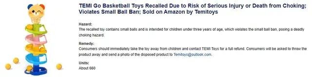 近期还有多款玩具因安全问题被强制召回,包括篮球玩具(违反小球禁令,存在致命的窒息危险)、磁浮堆叠玩具(违反玩具磁铁强制标准)和LED手套玩具(不符合含纽扣电池玩具的强制标准)。