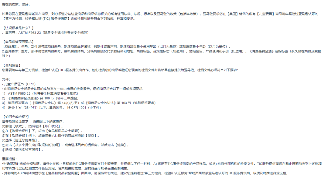 面对新规,卖家需要在卖家后台“账户状况控制面板(AHD)”查看具体截止日期,积极响应亚马逊平台新规政策,与平台认可的TIC机构合作,确保报告真实有效,产品合规。