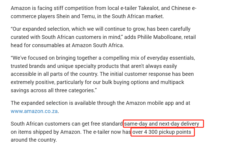 本土巨头Takealot已在半年财报中承认:亚马逊的物流优势正挤压其增长空间。一位约翰内斯堡用户感叹:“昨晚下单的猫粮,今早出现在小区取货柜,这速度连Takealot都难做到。”