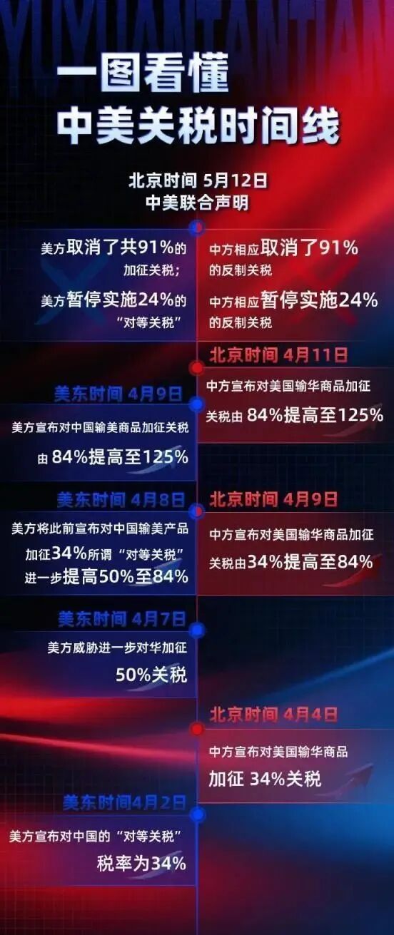 5月新协议: 中美日内瓦会谈后,美国宣布90天内将关税下调至10%(叠加芬太尼20%,部分商品实际为30%)。