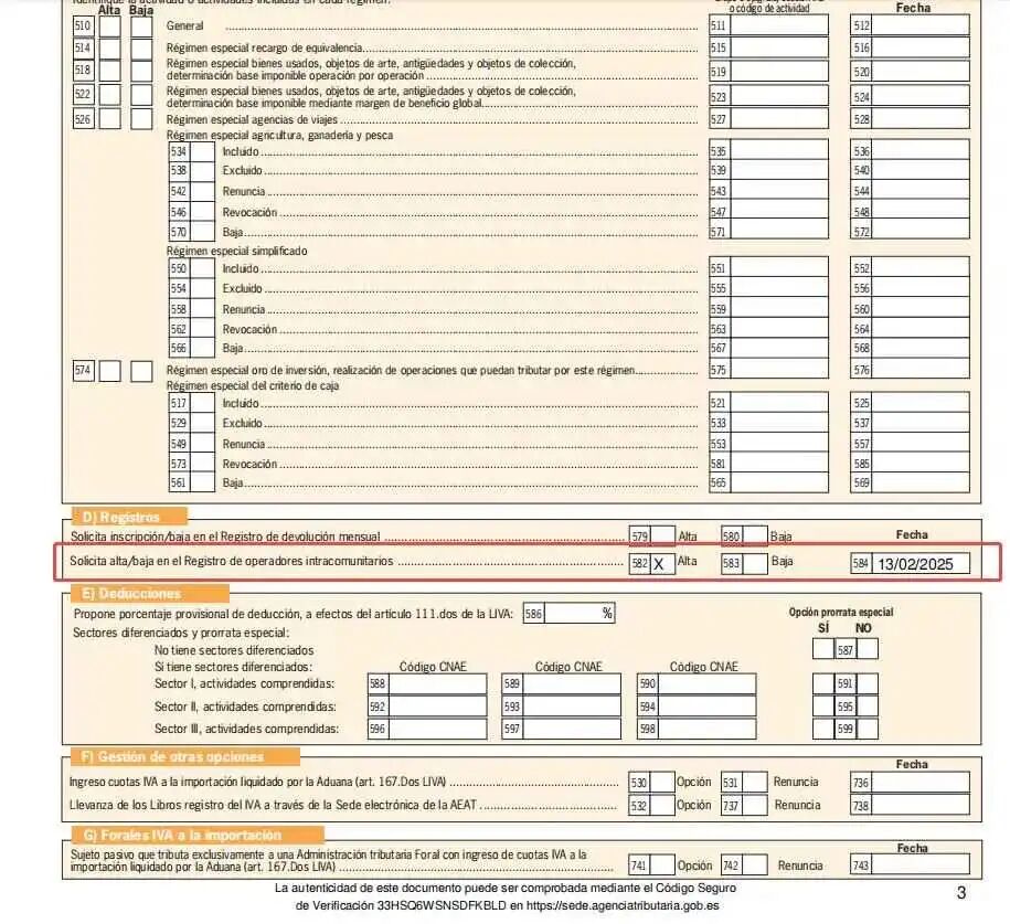 关键操作:勾选130格(“Registro de Operadores Intracomunitarios”模块)