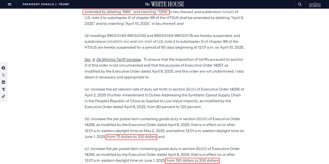 白宫宣布,自2025年5月2日美国东部夏令时间凌晨0:01起,自中国大陆和香港进入美国的包裹将不再适用800美元以下货值关税豁免以及配套的T86快速清关模式。根据新规,美国将对小额包裹征收120%关税,或统一收取每单100美元的固定费用(6月1日上调至200美元)。这也是继平地起高楼的关税新政后,砸向中国跨境从业者又一张巨额账单。