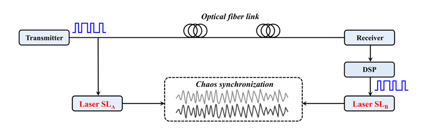 长距离混沌激光同步一直是研究的关切和挑战。两个混沌源可以通过直接耦合实现主从驱动式同步,也可以在同一个随机光信号注入下实现共同驱动式同步。已报道的驱动信号有混沌光或噪声光等模拟信号。但光纤链路传输过程中的色散、非线性、累积噪声等因素会对驱动信号造成损伤,严重限制了激光器混沌同步的距离。为均衡信号损伤,需要在光纤链路中配置特殊硬件进行色散补偿、低噪声分布式光纤拉曼放大等。这不仅会增加传输系统复杂度,也会增加与现行光纤通信传输线路兼容的难度。此外,模拟驱动信号的传输,需要占据一个波长信道,从而会影响光纤通信的传输容量。